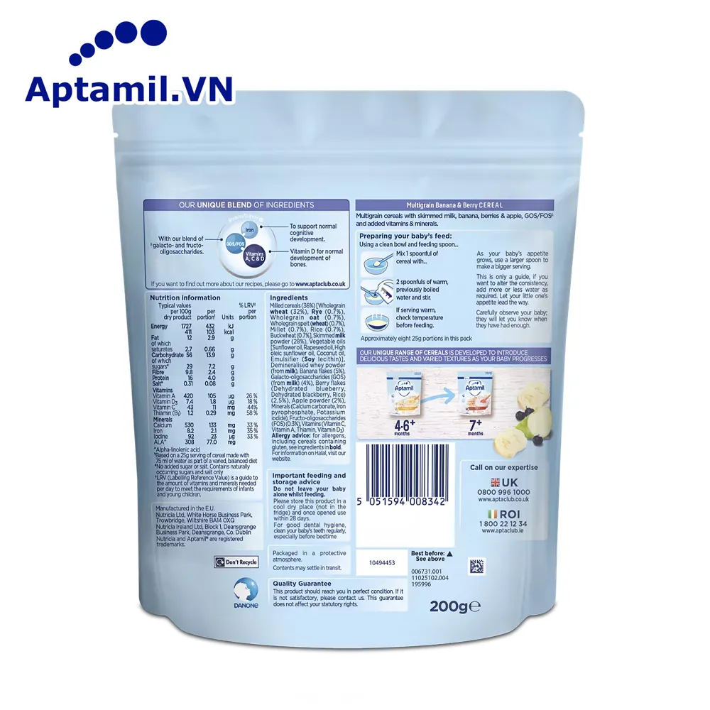 • Bột ăn dặm Aptamil ngũ cốc, chuối, hoa quả phù hợp cho bé từ 7 tháng tuổi, hỗ trợ bước đầu ăn dặm