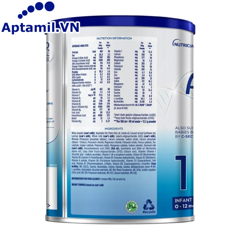 Sữa Aptamil New Zealand số 1 bao gồm các thành phần: hỗn hợp dầu thực vật (dầu cọ, dầu hạt cải, dầu dừa và dầu hướng dương) 20,8%, Bột đạm whey (sữa bò) 33,5%, đường lactose (sữa bò) 17%, galacto-oligosaccharides (GOS) (sữa bò) 6%, sữa nguyên chất (sữa bò) 15,7%, các khoáng chất [Dipotassium hydrogen phosphate (Potassium phosphate, dibasic), calci carbonat (calcium carbonate), natri citrat (sodium citrate), calci phosphate (tricalcium diphosphate), kali clorid (potassium chloride), magnesi chlorid (magnesium chloride), kali citrate (Potassium citrate), sắt (II) sulfat (ferrous sulphate), kẽm sulfat (zinc sulphate), đồng sulfat (copper sulphate), kali iodid (potassium iodide), mangan sulfat (manganese(II) sulphate), natri selenat (sodium selenite)], sữa tách béo (sữa bò) 2,5%, fructo-oligosaccharides chuỗi dài (lcFOS) (rễ rau diếp xoăn), DHA (dầu cá), acid arachidonic (ARA) (dầu Mortierella alpina), Vitamin C (L-Ascorbic acid + Sodium L-ascorbate), Vitamin E (DL-alpha tocopheryl acetate), Nicotinamide, acid pantothenic (calcium d-pantothenate), Vitamin B1 (thiamin hydrochloride), riboflavin, Vitamin A (retinyl acetate), Vitamin B6 (Pyridoxin hydrochloride), Vitamin D3 (Cholecalciferol), acid folic (N-Pteroyl-L-glutamic acid), Vitamin K1 (phytomenadion), d-biotin, Vitamin B12 (Cyanocobalamin), taurin, nucleotides [Cytidine 5′-monophosphate (CMP), Uridine 5′-monophosphate sodium salt (Disodium Uridine 5-monophosphate salt), Adenosine 5′-monophosphate (AMP), Inosine 5′-monophosphate sodium salt (Disodium Inosine 5-monophosphate salt), Guanosine 5′-monophosphate sodium salt (Disodium Guanosine 5′-monophosphate salt)], Choline chloride, inositol, B. breve M-16V, L-carnitin, chất nhũ hóa [lecithin (đậu nành) (INS 322 (i)], chất chống oxy hóa [Tocopherol concentrat (dạng hỗn hợp) (INS 307b), ascorbyl palmitat (INS 304), dl-alpha tocopherol (INS 307c)] và chất điều chỉnh độ acid (calci hydroxyd (INS 526), kali hydroxyd (INS 525), acid citric (INS 330)). Tất cả các chất phụ gia có nguồn gốc thực vật hoặc tổng hợp.